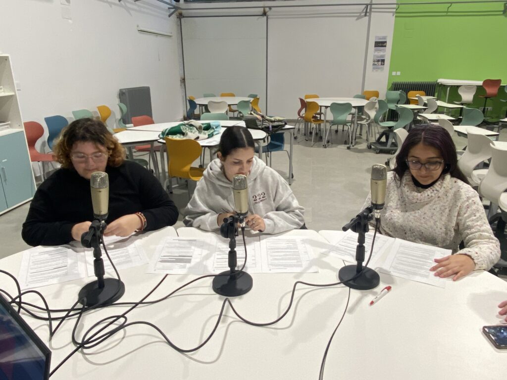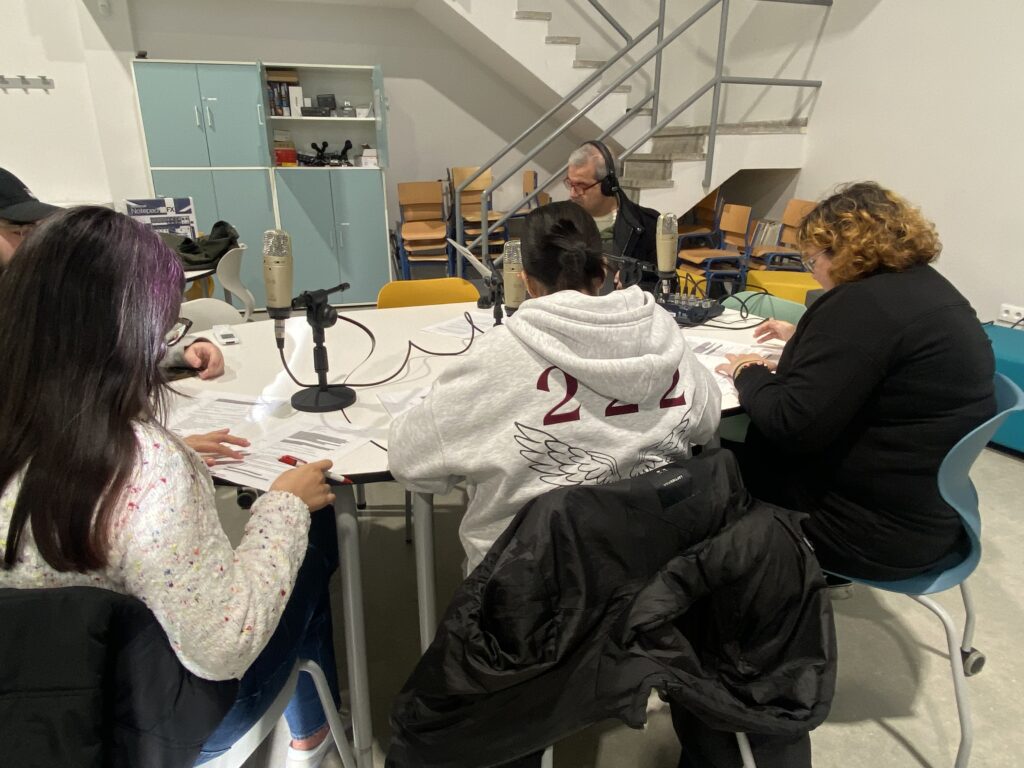 Trabajamos codo con codo con los profesores responsables del podcast de nuestro instituto, que nos ayudaron y nos lo hicieron todo mucho más fácil gracias a su dilatada experiencia, para elaborar el guión del programa, elección de las músicas y demás.