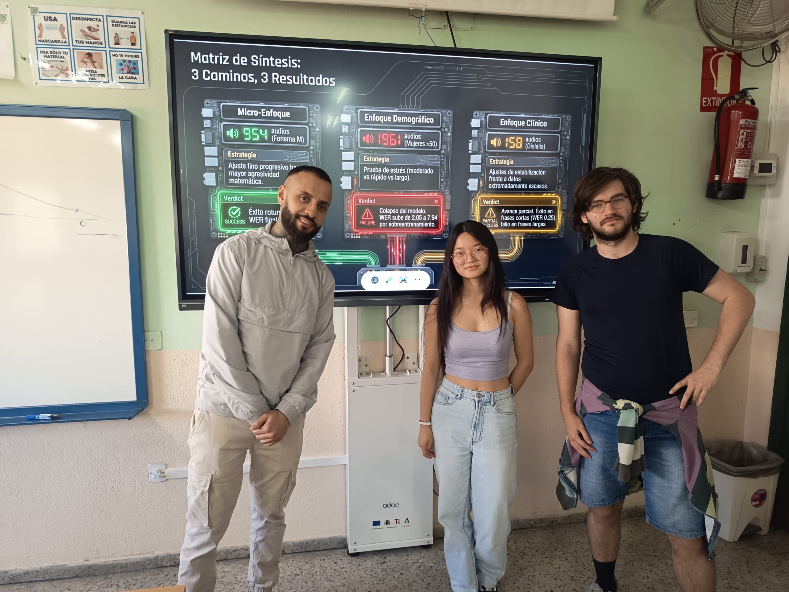 Un aspecto especialmente interesante del trabajo ha sido el enfoque adoptado por cada grupo. Mientras algunos equipos han centrado su análisis en datos relacionados con problemas en el habla, otros han trabajado con subconjuntos organizados por género o por rangos de edad. Esta diversidad de enfoques ha permitido comparar cómo influyen estas variables en el rendimiento del modelo, evidenciando la importancia del contexto y de la representatividad de los datos en sistemas de inteligencia artificial.